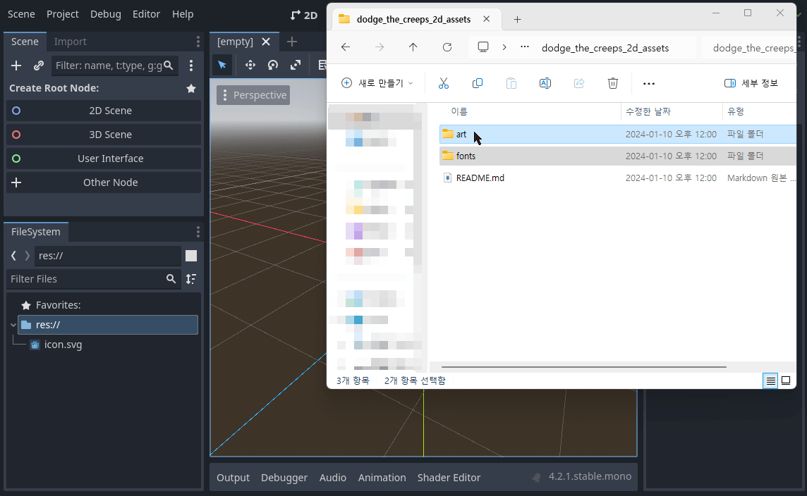 - dodge_the_creeps_2d_assets.zip을 다운 받아 압축을 푼다.