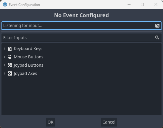 move_right가 추가되면 Deadzon에 있는 ➕아이콘을 선택한다.- Event Configuration 팝업창이 열리면 Listening for input... 필드가 활성화되어 있다.