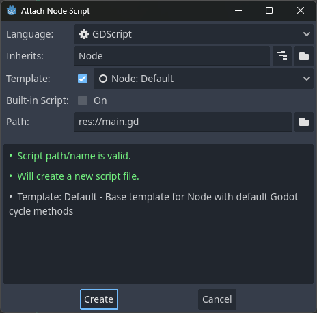 res://Main.tscn파일을 열어 Main 노드를 선택한다.- Attach Script... 를 선택하여