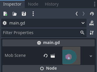 @export로 선언한mob_scene변수 Main 노드에 Mob Scene 속성으로 추가된다. - Main 노드에 추가된 Mob Scene 속성과
