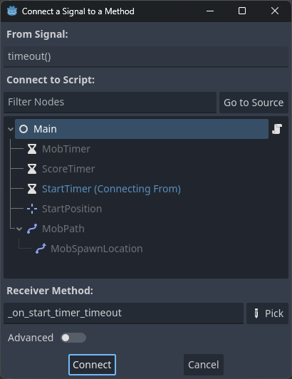 - StartTimer, ScoreTimer, MobTimer 노드의 timeout 시그널을 Main 노드와 연결한다.