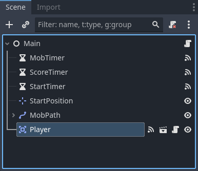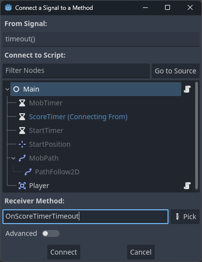 - StartTimer, ScoreTimer, MobTimer 노드의 timeout 시그널을 Main 노드와 연결한다.