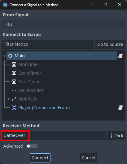res://main.cs스크립트에 추가했던GameOver메소드와 연결한다.