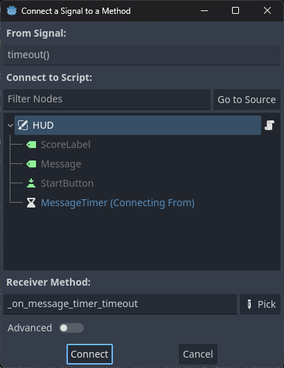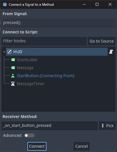 - StartButton 노드의 pressed 시그널을 HUD 노드와 연결한다.