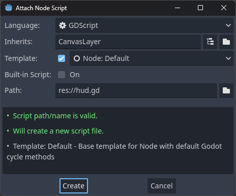 res://HUD.tscn파일을 열어 HUD 노드를 선택한다.- Attach Script... 를 선택하여