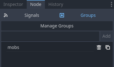 res://Mob.tscn파일을 열어 Mob 노드를 선택한다.- 오른쪽 화면에 있는 Node 도크를 선택한다.