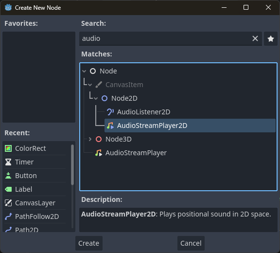 res://Main.tscn파일을 연다.- AudioStreamPlayer2D 노드를 Main 노드의 자식으로 추가한 후 Music으로 이름을 수정한다.