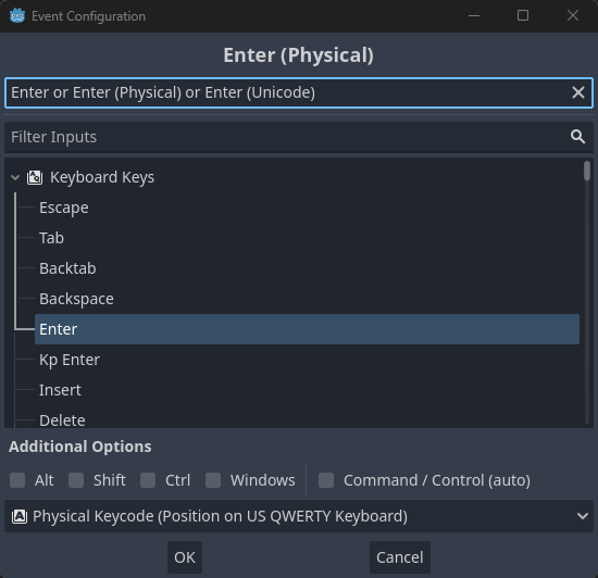 - Inspector 도크에서 추가된 InputEventAction 리소스를 클릭하여하여 InputEventAction 속성이 나오도록 만든다.