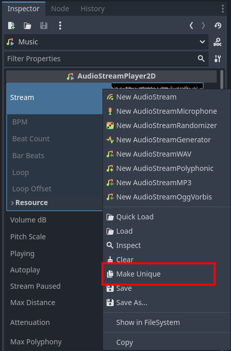 - 메뉴에서 Make Unique를 선택하여 AudioStreamOggVoribs 속성도 설정할 수 있도록 만들어 준다.