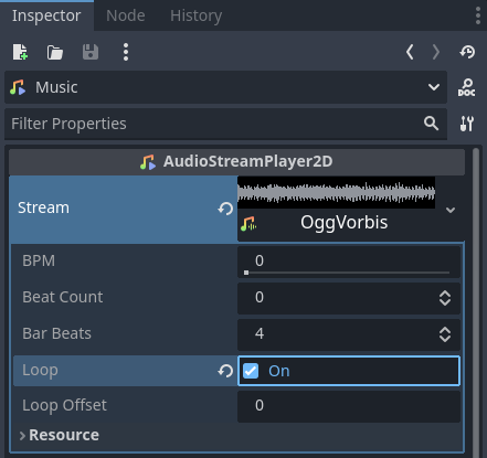 res://art/House In a Forest Loop.ogg파일을 드래그한다. - Stream 속성에 연결된 파일을 클릭하여 AudioStreamOggVoribs 속성이 나오도록 만든다.