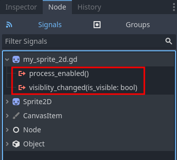 signal process_enable처럼 신호만 발생시킬 수도 있고,signal visiblity_changed처럼 필요한 변수를 함께 전달할 수도 있다.my_sprite_2d.gd스크립트를 저장한 후 Node 도크를 확인하면 선언한 시그널을 확인할 수 있다.