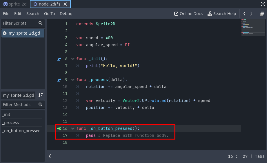스크립트에 자동으로_on_button_pressed함수가 생성된다.