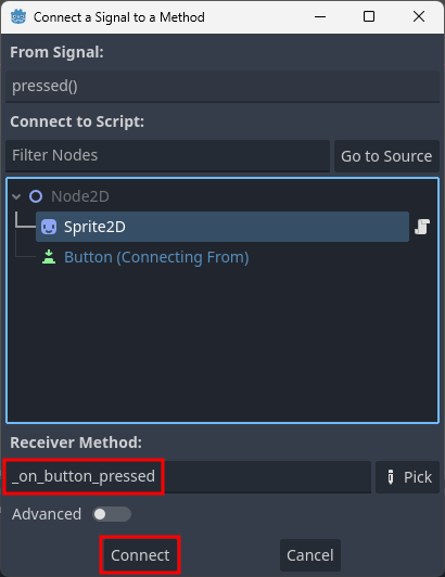 - Connect a Signal to a Method 팝업창이 열리면서 Sprite2D 노드가 자동으로 선택된다.