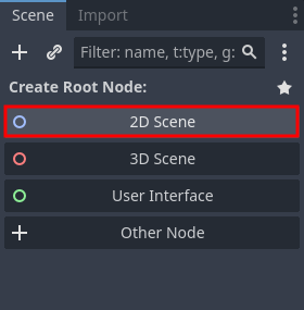 - Scene 도크에서 2D Scene를 선택하여 Node2D 노드가 새로 만든 씬의 루트 노드가 되도록 만든다.